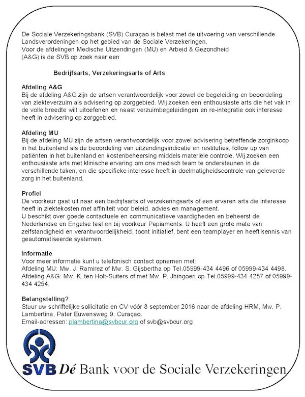 De Sociale Verzekeringsbank (SVB) Curaçao is belast met de uitvoering van verschillende Landsverordeningen op het gebied van de Sociale Verzekeringen. Voor de afdelingen Medische Uitzendingen (MU) en Arbeid & Gezondheid (A&G) is de SVB op zoek naar een